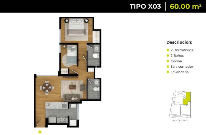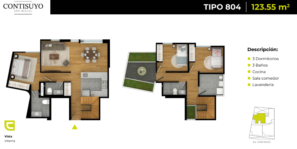 Departamentos en venta en Calle Contisuyo 260, San Miguel, con áreas desde 60 m² hasta 123.55 m² y opciones de 2 y 3 dormitorios. Diseñados con ambientes amplios y funcionales, ideales para un estilo de vida moderno.