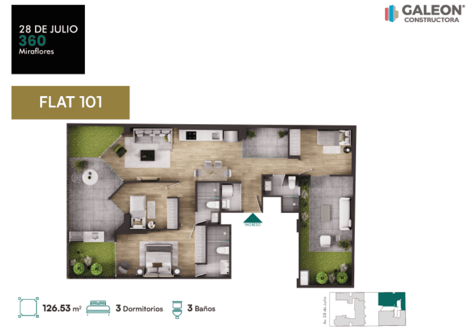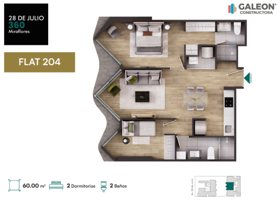 Departamentos en venta en Miraflores, Av. 28 de Julio 360. Diseñados con un estilo moderno y funcional, con áreas desde 60 m² hasta 126.53 m² y opciones de 2 y 3 dormitorios. El edificio ofrece exclusivas amenidades como gimnasio, lobby, parque privado, piscina, sala de niños y terraza, pensadas para disfrutar comodidad, seguridad y calidad de vida en uno de los distritos más valorados de Lima.